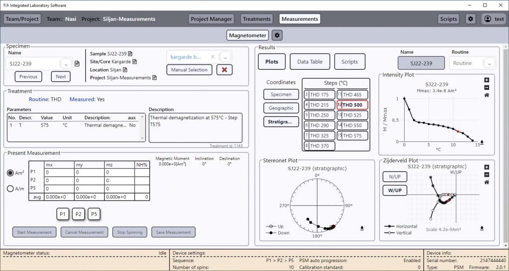 对于古地磁⼯作流程,ILS包含⼀个全面的标准测量程序库,包括天然剩磁 (NRM)、交变退磁(AFD)、热退磁(THD)、等温剩磁(IRM)、非磁滞剩磁(ARM)、各向异性剩磁(AARM)和背景场(BF),以及用户定义的程序等。这使得用户能够针对单个样本或样本组构建、执⾏和保存的多步骤测量序列。对于每个测量步骤,ILS会在样品架上显示所需的样本方向,并且在自动序列(最多六个位置)期间无需用户额外输入;完成后,软件会自动进入测量列表中的下⼀个样本。结果会以表格和图形形式实时显⽰,包括磁化强度分量(Mx, My, Mz)、总磁化强度模量(|M|)、磁偏角/磁倾角(D, I)以及地理/地层坐标下的对应值(Dg, Ig, Ds, Is),并通过赤平极射投影图(stereonet)和齐氏矢量图(Zijderveld plots)进行可视化,坐标可选择样本、地理或构造坐标,并使用北/上和西/上投影方式。每个样本或每组的结果可以多种格式导出。